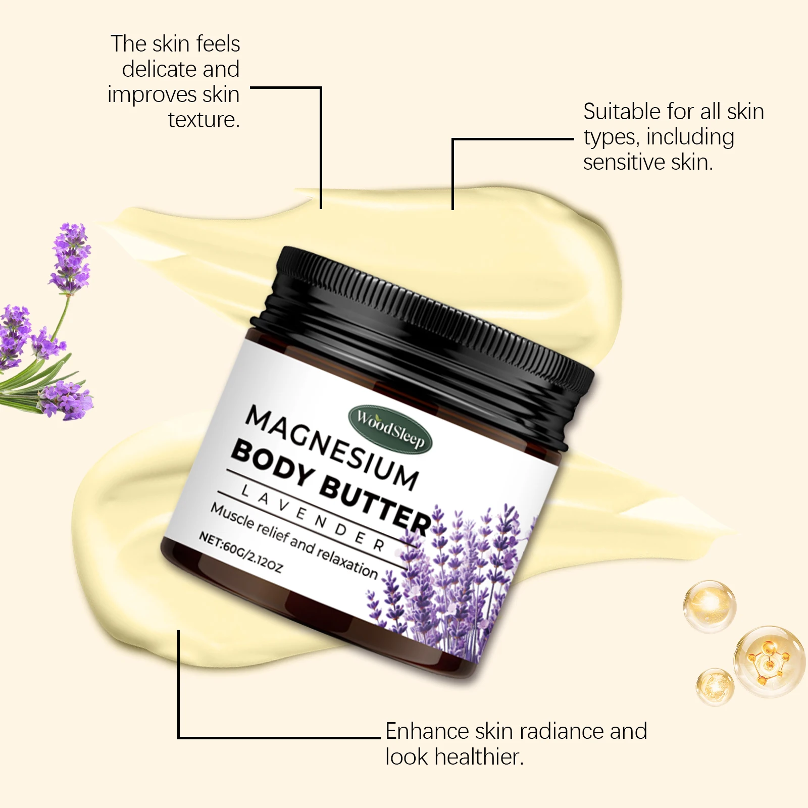 Woodleep Lavender Magnesium Body Cream 2.02oz Natural Sleep Skincare Relaxation Deep Moisturizing Refreshing Body Lotion
